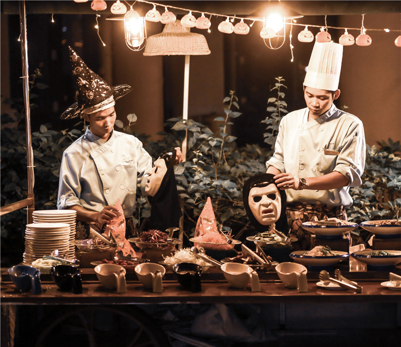 在這個充滿鬼魅氣息的夜晚,加勒比海燒烤園進行了一番充滿光怪陸離的萬圣節主題裝飾。充滿各種詭異表情的裝飾、傳統萬圣節菜肴和甜品飲料,讓賓客目不暇接、大飽口福。新鮮現開現烤生蠔、日式料理檔、清蒸冰鎮海鮮檔、BBQ燒烤檔和各式生猛海鮮,應有盡有。席間更有喬裝打扮的酒店工作人員活躍于賓客之間,各路“鬼怪”傾巢出動,為賓客們奉上一場難忘的“貪吃鬼行動”盛宴。