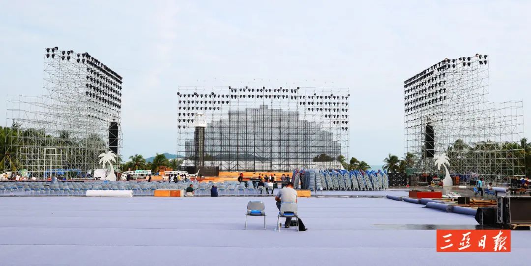 舞臺前擺放的椰樹、電影膠卷等裝飾品呈現(xiàn)著椰風(fēng)海韻,“影”味十足。舞臺下紅色和藍(lán)色的座椅也被整齊排開,屆時現(xiàn)場可容納近3100人觀禮。