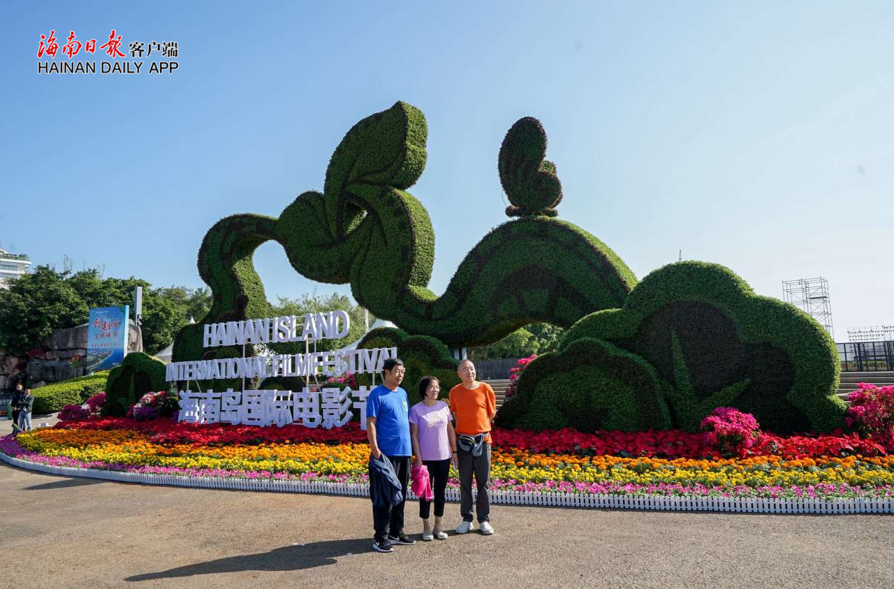 12月3日,在三亞市海棠廣場,游客在第三屆海南島國際電影節花壇前合影。 本報記者 武威 攝