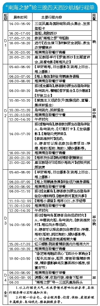 據(jù)了解,目前復(fù)航的西沙旅游航線行程為4天3晚。根據(jù)客艙房型的不同,“南海之夢”輪艙位價格為4880-26800元。配套有生活區(qū)域和娛樂區(qū)域,包含房間、餐廳、書店以及電影院等。行程圍繞全富島、銀嶼島進(jìn)行登島觀光活動,領(lǐng)略西沙的純凈之美。期間有南海西沙知識講座、專業(yè)演藝團(tuán)隊(duì)表演以及漁家民俗體驗(yàn)等特色活動。