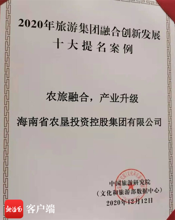 新海南客戶端、南海網、南國都市報12月15日消息(記者 杜倬荷 通訊員 胡建南)近日,中國旅游集團發展論壇在北京召開期間,發布了文化和旅游融合發展案例專題研究成果,海南省農墾投資控股集團有限公司(以下簡稱海墾集團)的“農旅融合,產業升級”獲得十大提名案例。