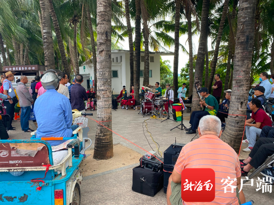 然而,通告上所述事項,在三亞灣卻并不少見。12月16日下午,記者來到三亞灣看到,在三亞灣路和團結(jié)街交叉口附近人行道上,一伙人用紅繩圍出了一塊區(qū)域,正在進(jìn)行露天“演唱會”。架子鼓、薩克斯、吉他、音響......設(shè)備可謂齊全,歌者站在麥克風(fēng)前引吭高歌,伴奏聲此起彼伏,引來眾多過往路人圍觀。一名男士唱完兩曲后,坐在一旁的一位女性接替他,來到了麥克風(fēng)前,繼續(xù)演唱。