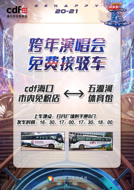 活動(dòng)期間,cdf海口市內(nèi)免稅店準(zhǔn)備接駁車服務(wù),演唱會(huì)觀眾可于12月31日16:30、17:00、17:30、18:00,前往cdf海口市內(nèi)免稅店(射手座B門)搭乘專車至五源河體育館,演出結(jié)束后通過現(xiàn)場乘坐指引返回市內(nèi)。