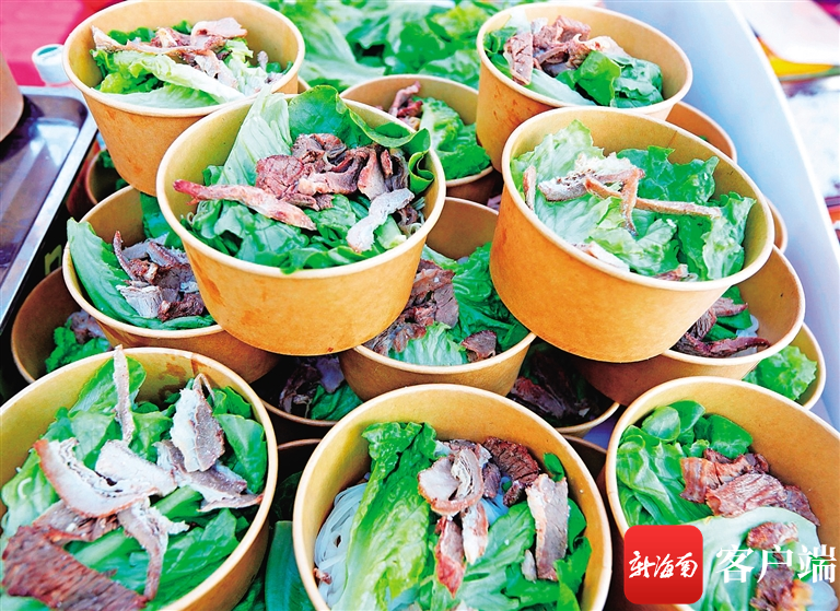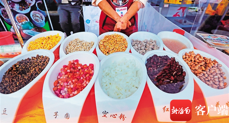 瓊海涼爽展位擺上了綿綿冰、榴蓮、椰子凍、芒果、南瓜露等系列特色小吃;大路小黃牛肉粉展位,一口大大的鐵鍋里正熬著鮮湯,遠遠就聞到香氣飄來;還有雜糧糕、鮮椰絲益母草粑、脆皮斑斕卷、斑斕糕、紅燒乳鴿、嘉積鴨、溫泉鵝……瓊海有名的特色美食小吃應有盡有。“沒想到在海口也能吃到這些瓊海美食小吃,真不錯,我去瓊海旅游時就吃過一些,至今還念念不忘哩!”在海口生活的“候鳥”老人吳先生,上午看到展銷會的消息,下午就趕過來買了一些。