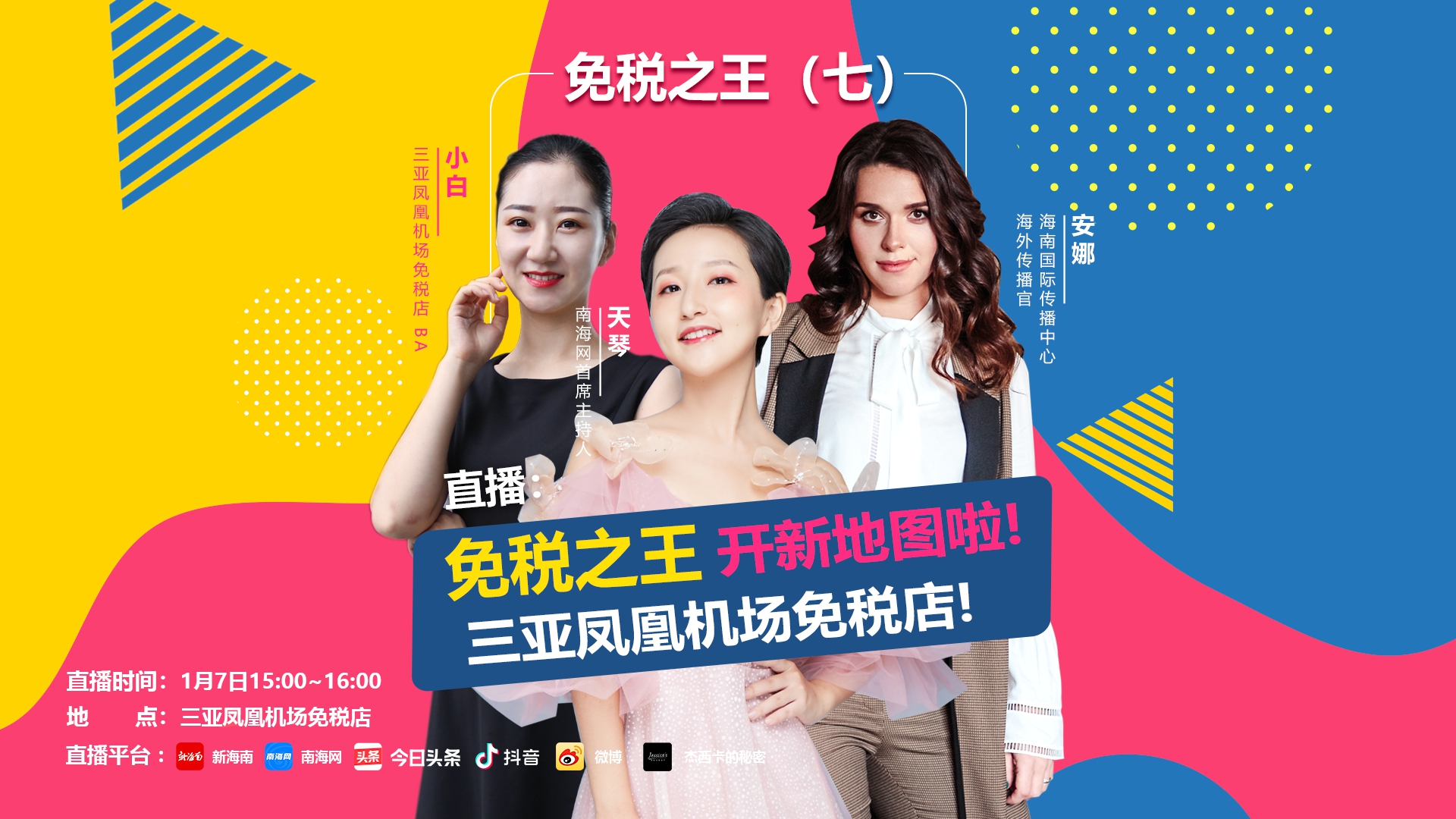 1月7日15:00至16:00,直播將在新海南客戶端、南海網、抖音、頭條、新浪微博、杰西卡的秘密等平臺進行,主播天琴將攜手三亞鳳凰機場免稅店工作人員小白、海南國際傳播中心海外傳播官安娜,一起走進免稅店,為您探訪最新的潮流免稅資訊,了解機場免稅店的購物流程、環境等情況,快來關注直播間,留言參與互動吧!