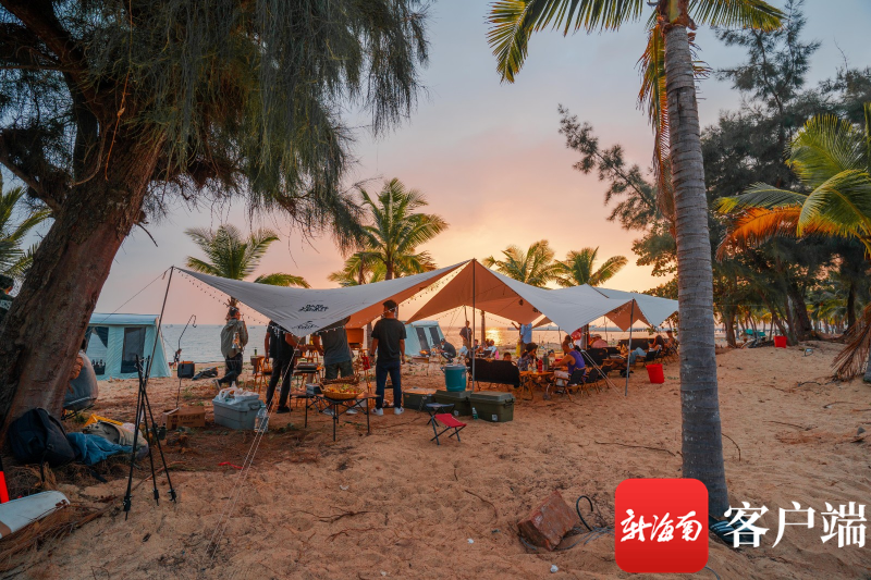 如果說白天的天涯海角太過喧鬧,那晚上在天涯海角露營則是另一種風情。隨著豪華露營文化在海南流行,天涯海角也在景區西區沙灘推出了野奢露營產品。連日來,多次接待野外露營愛好者,每日接待量在40人以上。這里的露營體驗與用3秒就打開的帳篷在野外湊合一晚的體驗完全不一樣。營客們可以不用操心裝備,營地有專業工作人員指導營客們搭建自己的帳篷,并搭建一個營地村落,隨后便可體驗露營生活。帳篷里配置氣墊床、地毯和床上用品;營地中有投影儀、音箱、裝飾燈光;餐食提供紅酒、牛排、水果、咖啡……讓野外露營也充滿了儀式感。