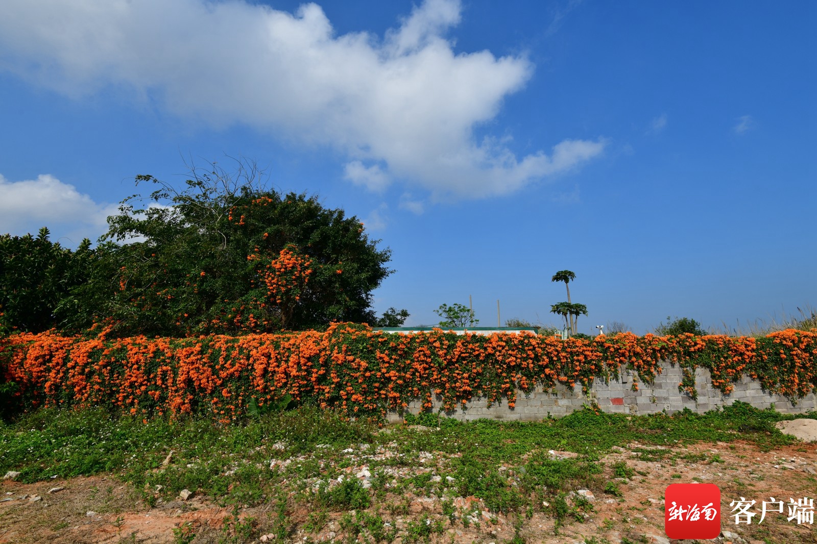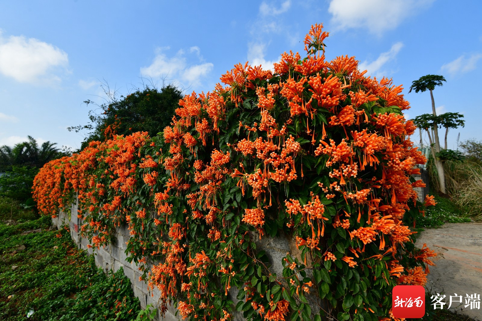 新海南客戶端、南海網、南國都市報2月24日消息 (記者 陳衛東)2月24日,記者在海口市秀英區長天路附近一處廢品回收點看到,這里的圍墻上爬滿了炮仗花。眼下正是炮仗花開花的時候,30多米長的圍墻,全被炮仗花覆蓋,非常壯觀。