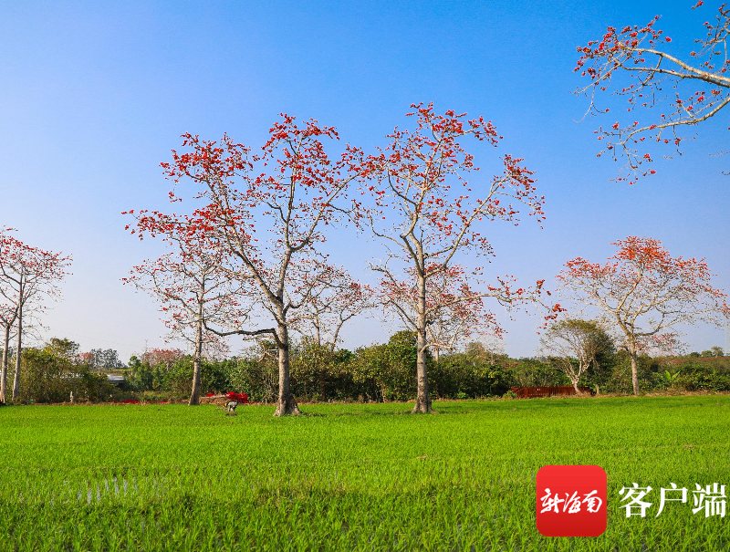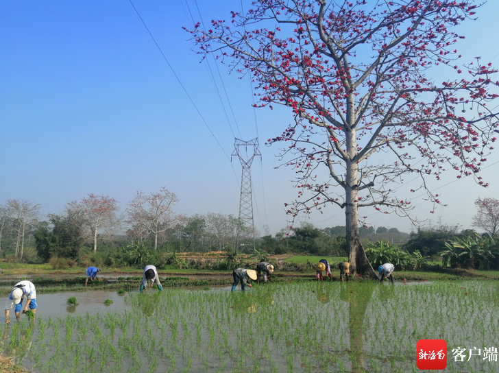 木棉花開恰逢春耕,農(nóng)田里一片繁忙,木棉花落在稻田里,點(diǎn)綴著綠色的春天,木棉樹與插秧的農(nóng)民、生機(jī)勃勃的稻田勾勒出一幅優(yōu)美的瓊島春耕圖。