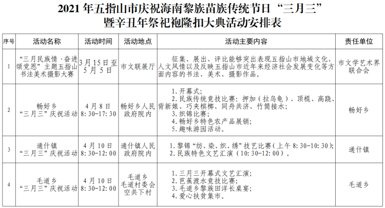 新海南客戶端、南海網、南國都市報3月24日消息(記者 石祖波)農歷三月三即將來臨,2021年“黎族苗族傳統節日三月三”系列活動暨辛丑年祭祀袍隆扣大典將上演。記者從五指山市相關部門獲悉,今年農歷三月三,五指山市將舉辦辛丑年祭祀袍隆扣大典、文藝晚會等系列活動。此外,五指山市各鄉鎮也將舉辦趣味民俗活動、海南民歌暨竹木器樂比賽等活動,迎接廣大市民游客到來。