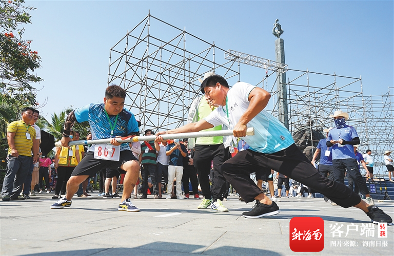 4月13日,三亞市慶祝“三月三”節慶活動在天涯海角游覽區舉行,選手參加頂棍項目的比賽。海南日報記者 武威 攝?