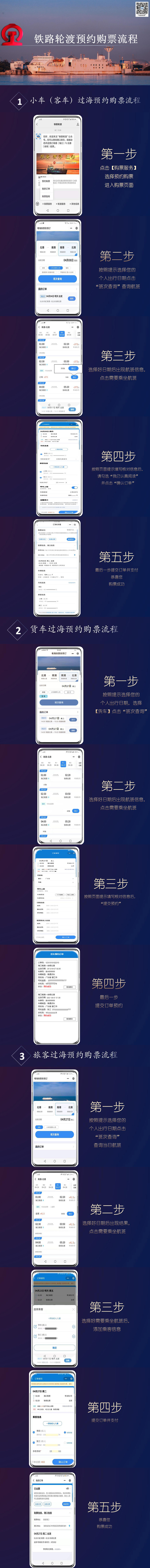 答:可以關注“瓊州海峽輪渡管家”及“新海港”“鐵路輪渡”微信公眾號,根據出行計劃提前在線上預約購票;也可以通過攜程、同程、椰城市民云等第三方平臺提前辦理購票手續。