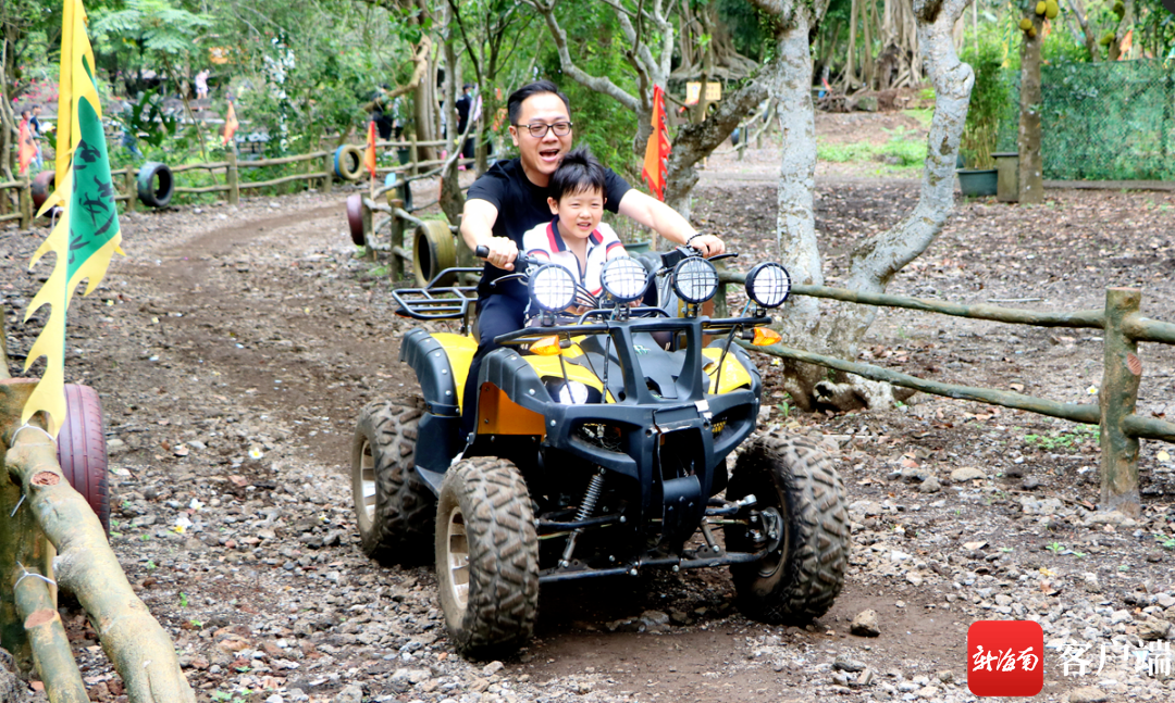 城市火山上,綠樹成蔭,游客們在火山石山路中穿越雨林,觀賞熱帶植被,看萬年熔巖流淌過的痕跡。當天,前來登山的游客也絡繹不絕。在野戰基地,一聲聲尖叫此起彼伏,游客們穿上颯爽軍裝,端起槍支,穿梭在叢林中展現各種隊形陣勢,投入到扮演士兵和將領的角色中。“沒想到火山口還有這種娛樂項目,讓孩子玩得很開心?!眮碜越鞯挠慰屠钏粗约旱暮⒆釉趨擦种写┧蟆?/span>