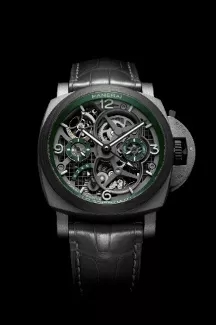 Luminor Tourbillon GMT 廬米諾系列陀飛輪兩地時腕表表殼以高性能的五級鈦金屬制造,腕表的表圈、表冠以及表冠護(hù)橋裝置?的鎖桿皆采用Carbotech碳纖維復(fù)合物制造,外觀出色、色調(diào)柔和,與五級鈦金屬表殼形成視覺對比。在黑灰單色調(diào)的環(huán)繞下,軍綠色表盤仿若點睛之筆。懸浮于表盤外緣的數(shù)字時標(biāo)、小秒盤、24小時顯示和動力儲存顯示的設(shè)計亦奪目出眾。