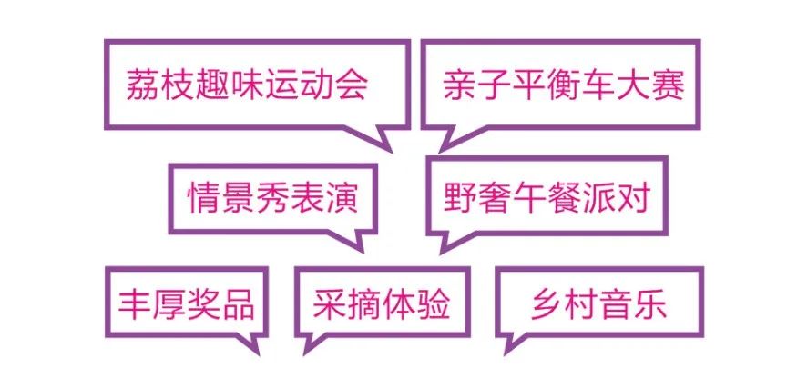 荔枝趣味運動會,每一輪游戲環(huán)節(jié)都有豐厚的獎品,現(xiàn)場游客只要在規(guī)定時間內(nèi),在指定區(qū)域采摘荔枝現(xiàn)場實景秀打卡拍照,通過微信朋友圈、抖音視頻等平臺分享,點贊人氣最高者將獲得驚喜禮品。以親子為主的荔枝平衡車大賽,將讓每個親子家庭穿梭在荔枝園林之間,在荔海農(nóng)莊紅土之上,體驗不一樣的田園賽道。野奢午餐派對將呈現(xiàn)手風(fēng)琴、打鼓和鄉(xiāng)村音樂演藝、荔枝賦朗誦等情景秀,在以原生態(tài)美食為主荔枝野餐長桌上享受愜意的美好生活。