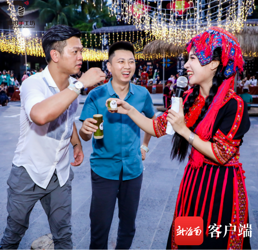 5月29日下午,海南陵水椰田古寨首屆黎族苗族文化節開幕。圖為市民游客品嘗山欄酒。記者 利聲富 攝