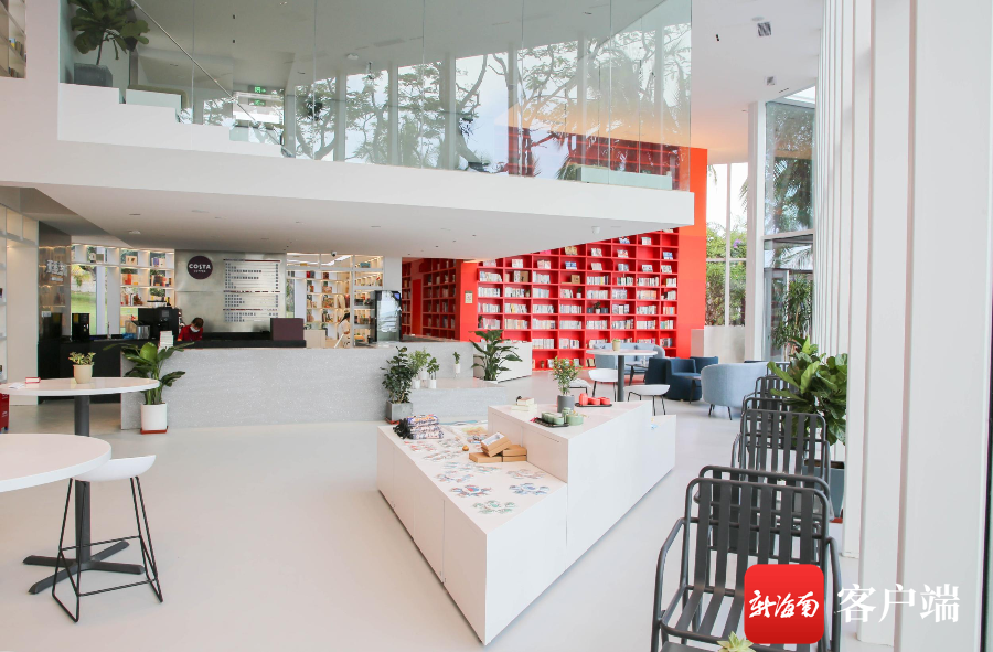 天涯書局為全玻璃幕墻結(jié)構(gòu),可360°透視觀景。從外向內(nèi)看,紅色漸變書架如火焰,白色書架如冰山,充滿幾何美感的三角形立面透過(guò)玻璃幕墻和椰林樹影,隱隱地吸引著游客的目光。書局室內(nèi)分為兩層,面積近450平方米,目前收納有圖書1800種,近兩萬(wàn)冊(cè),被營(yíng)造成極具生活美學(xué)的復(fù)合型文化空間,集結(jié)了主題書店、創(chuàng)客空間、藝術(shù)長(zhǎng)廊、創(chuàng)意市集、咖啡輕食、手工藝坊、親子空間、場(chǎng)地服務(wù)等功能于一體,在這里可以舉辦面對(duì)面的讀書交流、分享、文學(xué)沙龍、現(xiàn)場(chǎng)脫口秀、電影放映等活動(dòng),也可以看書、喝咖啡、看景、發(fā)呆,從內(nèi)向外看,室外的浪漫海景觸手可及。