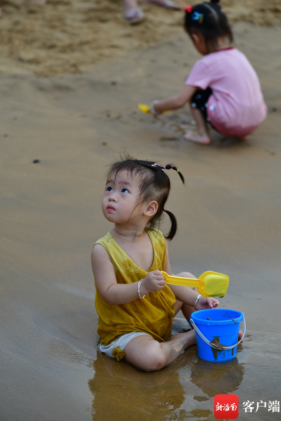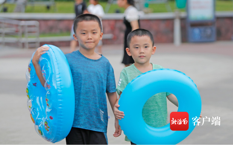 兄弟倆一起來假日海灘“洗龍水”。記者 汪承賢攝