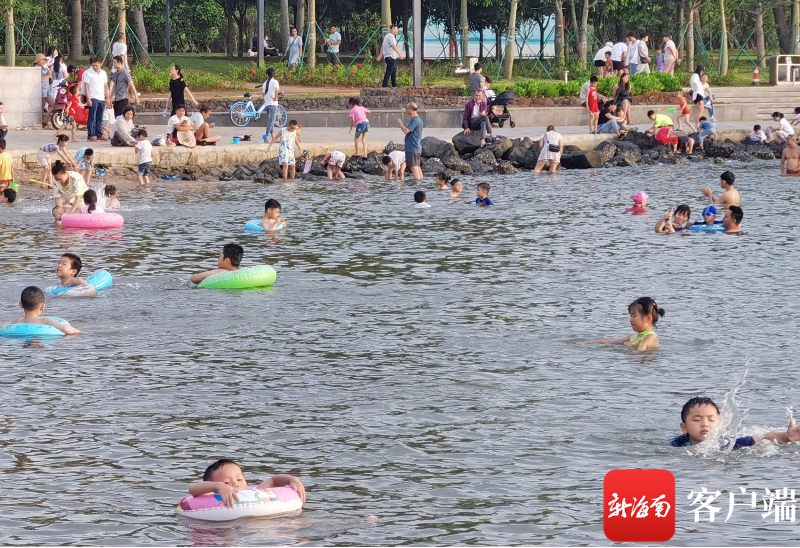 在海口灣人工沙灘旁小朋友在游泳。記者 汪承賢 攝