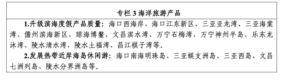 海洋旅游上,海南將升級海口西海岸、海口江東新區、三亞亞龍灣、三亞海棠灣、儋州濱海新區、瓊海博鰲、文昌淇水灣、萬寧石梅灣、萬寧神州半島、樂東龍沐灣、陵水清水灣、陵水土福灣、昌江棋子灣等濱海度假產品質量。發展海口南海明珠島、三亞蜈支洲島、三亞西島、文昌七洲列島、陵水分界洲島等熱帶近岸海島休閑游。