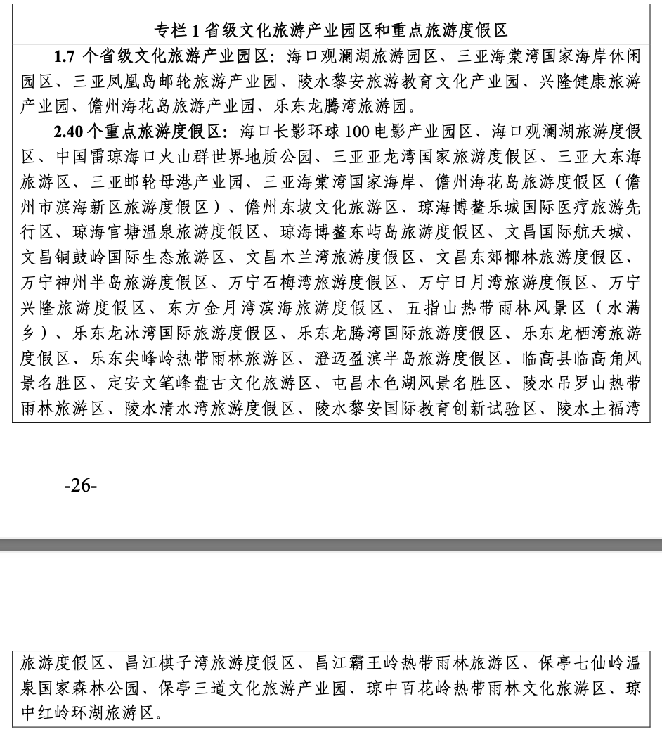 海南還將打造海口觀瀾湖旅游園區(qū)、三亞海棠灣國(guó)家海岸休閑園區(qū)、三亞鳳凰島郵輪旅游產(chǎn)業(yè)園、陵水黎安旅游教育文化產(chǎn)業(yè)園、興隆健康旅游 產(chǎn)業(yè)園、儋州海花島旅游產(chǎn)業(yè)園、樂(lè)東龍騰灣旅游園等7個(gè)省級(jí)文化旅游產(chǎn)業(yè)園區(qū)。發(fā)展海口長(zhǎng)影環(huán)球100電影產(chǎn)業(yè)園區(qū)、海口觀瀾湖旅游度假區(qū)、中國(guó)雷瓊海口火山群世界地質(zhì)公園、三亞亞龍灣國(guó)家旅游度假區(qū)等40個(gè)重點(diǎn)旅游度假區(qū)。