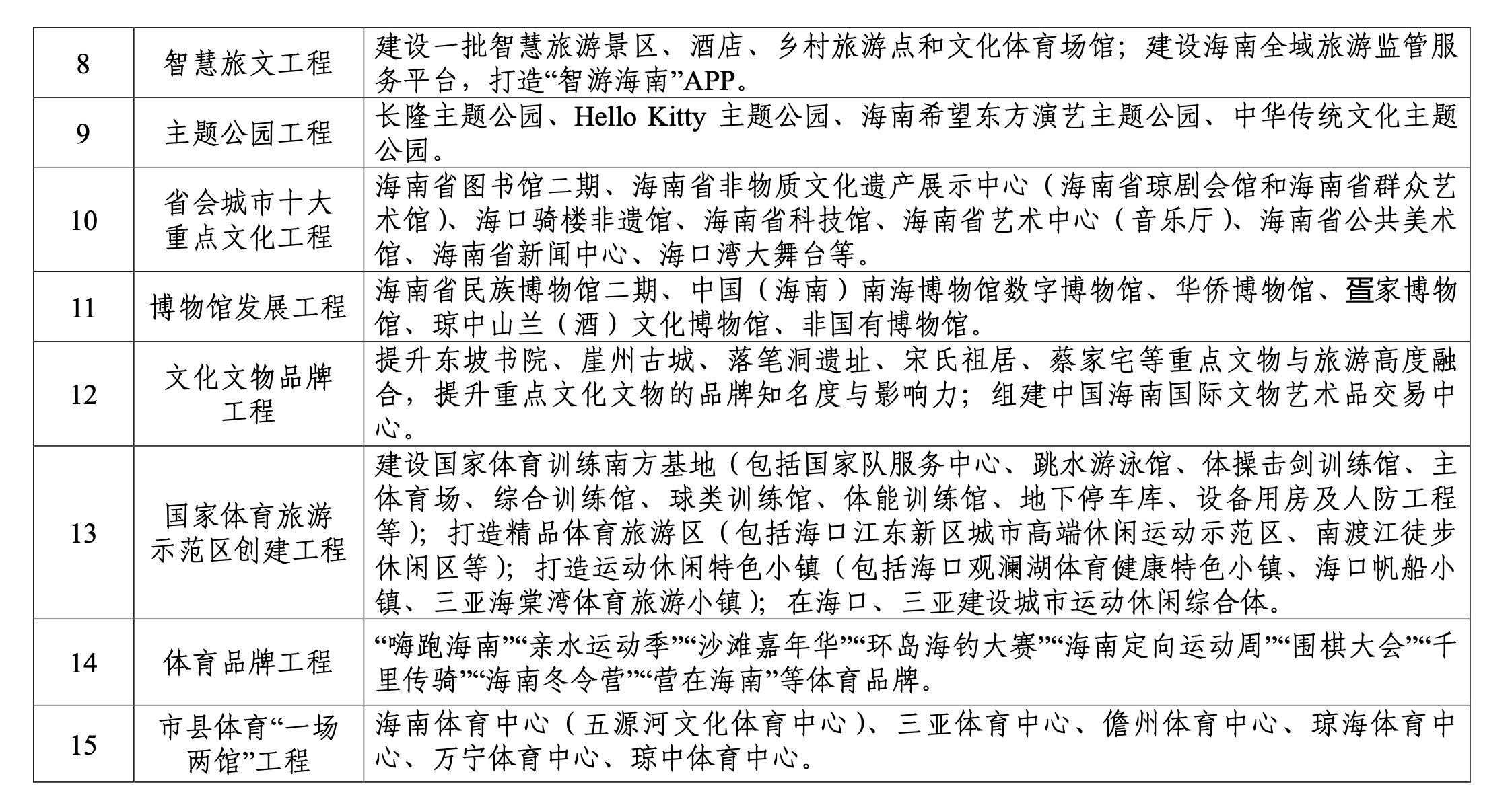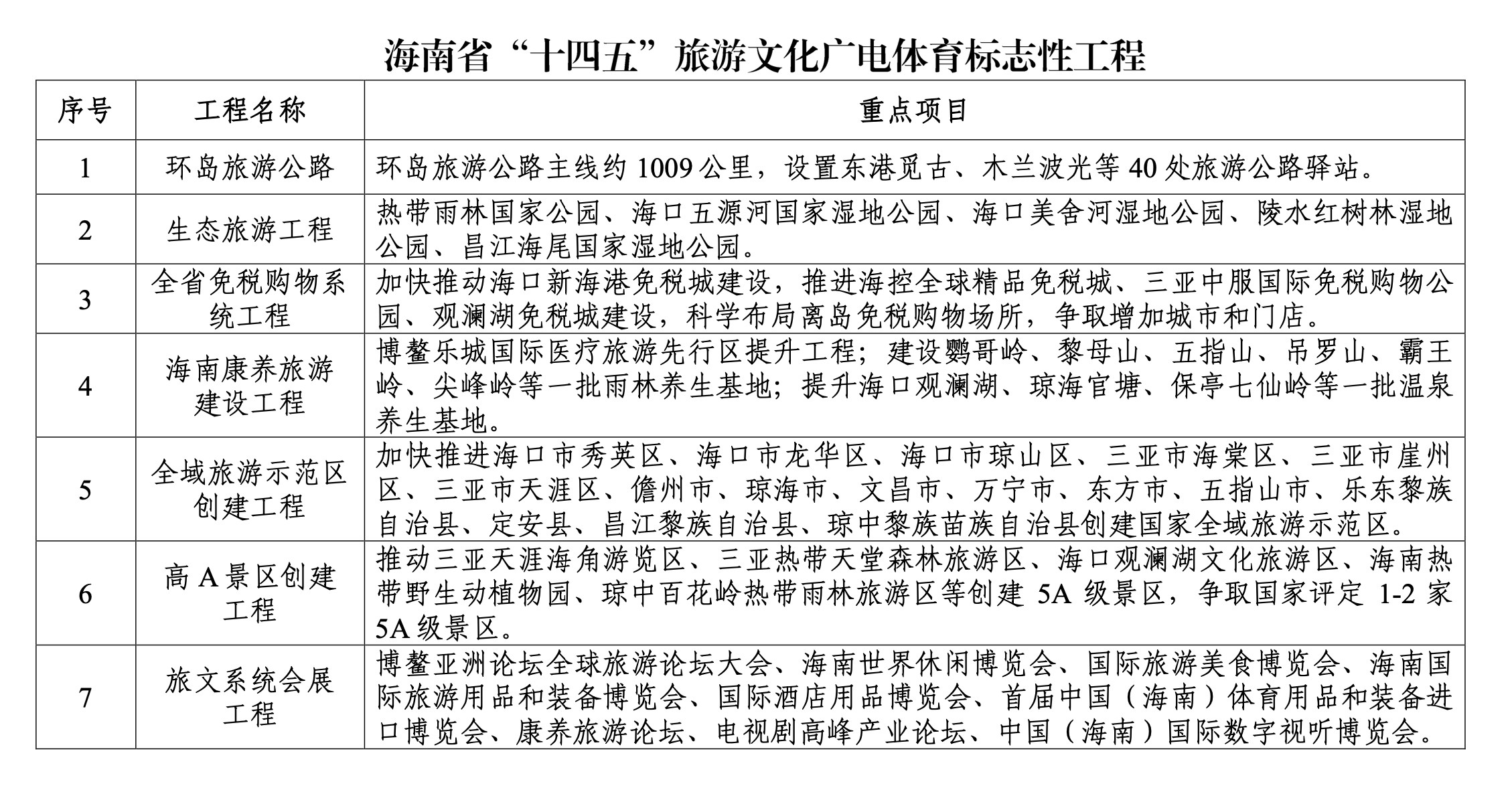 在“十四五”期間,海南將集中力量推進(jìn)環(huán)島旅游公路、生態(tài)旅游工程、全省免稅購(gòu)物系統(tǒng)工程、海南康養(yǎng)旅游建設(shè)工程、全域旅游示范區(qū)創(chuàng)建工程、高A景區(qū)創(chuàng)建工程、旅文系統(tǒng)會(huì)展工程、智慧旅文工程、主題公園工程、省會(huì)城市十大重點(diǎn)文化工程、博物館發(fā)展工程、文化文物品牌工程、國(guó)家體育旅游示范區(qū)創(chuàng)建工程、體育品牌工程、市縣體育“一場(chǎng)兩館”工程等15項(xiàng)旅游、文化、廣電、體育標(biāo)志性工程建設(shè)工作。