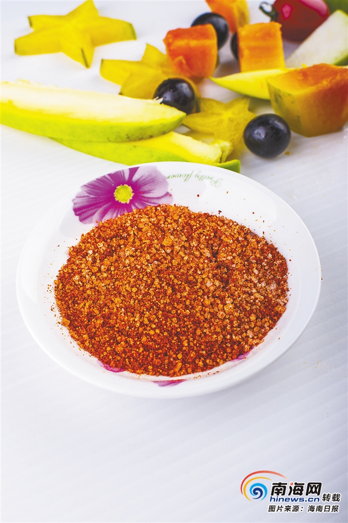 將新鮮的辣椒剁碎,和鹽佐拌,制成辣椒鹽,供水果點蘸專用。在海南,最常見的點蘸水果是青芒果、番石榴、菠蘿等。