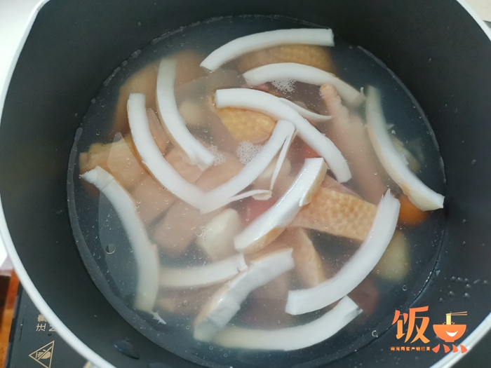 3.把山藥、馬蹄切塊,先放入馬蹄、生雞、椰子肉、椰子水煮十五分鐘。