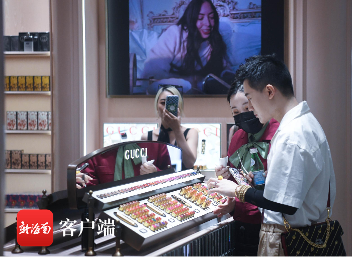 7月10日,游人在三亞海旅免稅城古馳美妝旗艦店選購化妝品。記者 沙曉峰 攝