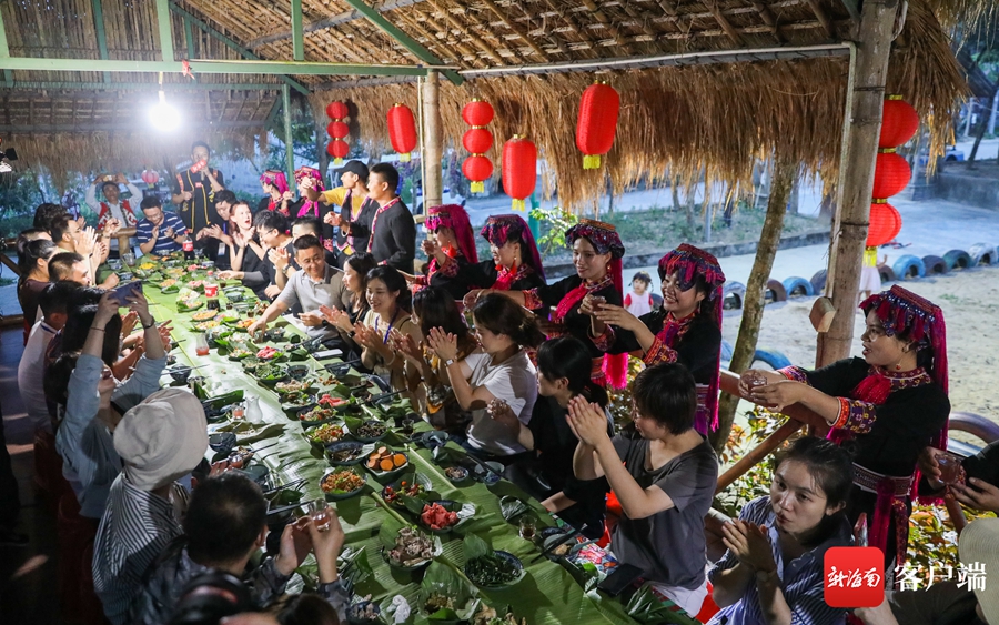 7月18日,全媒體采訪團走進瓊中什寒村,品嘗長桌宴美食。記者 李昊 攝
