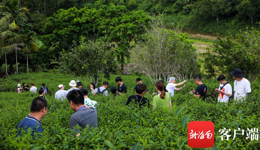 7月19日,全媒體采訪團走進五指山椰仙有機茶園參觀采訪,圖為采訪團成員來到茶園體驗采茶。記者 李昊 攝