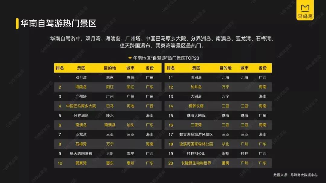 新海南客戶端、南海網、南國都市報8月19日消息(記者 張野)近日,馬蜂窩旅游發布了《2021年自駕游數據報告》,報告將2021年1-7月與上年同期進行比較,通過用戶畫像、搜索指數、互動指數等維度的大數據分析,解析了2021年自駕游市場的熱點、發展態勢以及自由行人群的行為偏好,并據此作出對自駕游人群未來消費行為的洞察和預測。其中,“自駕游最熱區縣鄉鎮”和“華南自駕游熱門景區”兩項排名中,萬寧都位列前茅。