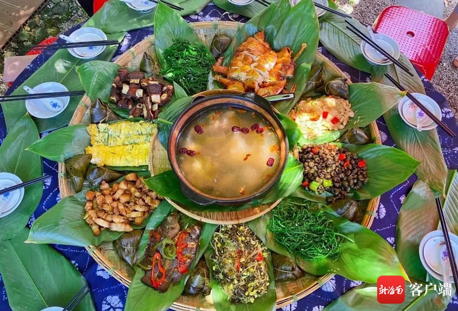 在瓊中,黎族苗族的飲食和它的舞蹈一樣豐富多彩,帶有濃濃的山區原生態特色。酸肉(肉茶)、上安小黃牛、撈葉煎蛋、河魚、苗家五色飯、黎家竹筒飯、黎族甜糟、山蘭玉液……光聽名字,就能感受大自然孕育出的香味。