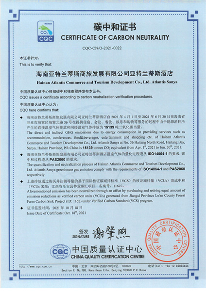 新海南客戶(hù)端、南海網(wǎng)、南國(guó)都市報(bào)11月4日消息(記者沙曉峰 )近日,經(jīng)由中國(guó)質(zhì)量認(rèn)證中心(CQC)進(jìn)行碳核查,復(fù)星旅文·三亞亞特蘭蒂斯完成了2021年4-6月份能源消耗所產(chǎn)生溫室氣體排放量的碳中和,達(dá)成CQC碳中和認(rèn)證,并獲得由中國(guó)質(zhì)量認(rèn)證中心(CQC)簽發(fā)的碳中和證書(shū),該證書(shū)也是海南省旅游業(yè)企業(yè)獲得的首張?zhí)贾泻妥C書(shū)。