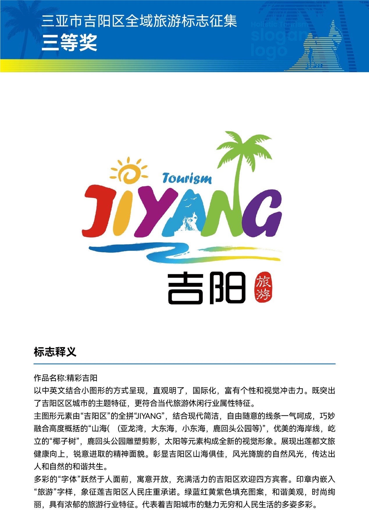 新海南客戶端、南海網(wǎng)、南國都市報(bào)11月10日消息(記者 劉麗萍)11月10日,由三亞市吉陽區(qū)全域旅游發(fā)展工作領(lǐng)導(dǎo)小組主辦的三亞市吉陽區(qū)全域旅游LOGO及口號(hào)征集評(píng)選結(jié)果揭曉,LOGO及口號(hào)兩個(gè)項(xiàng)目各評(píng)出1名一等獎(jiǎng)、1名二等獎(jiǎng)、1名三等獎(jiǎng)、3名入圍獎(jiǎng)。