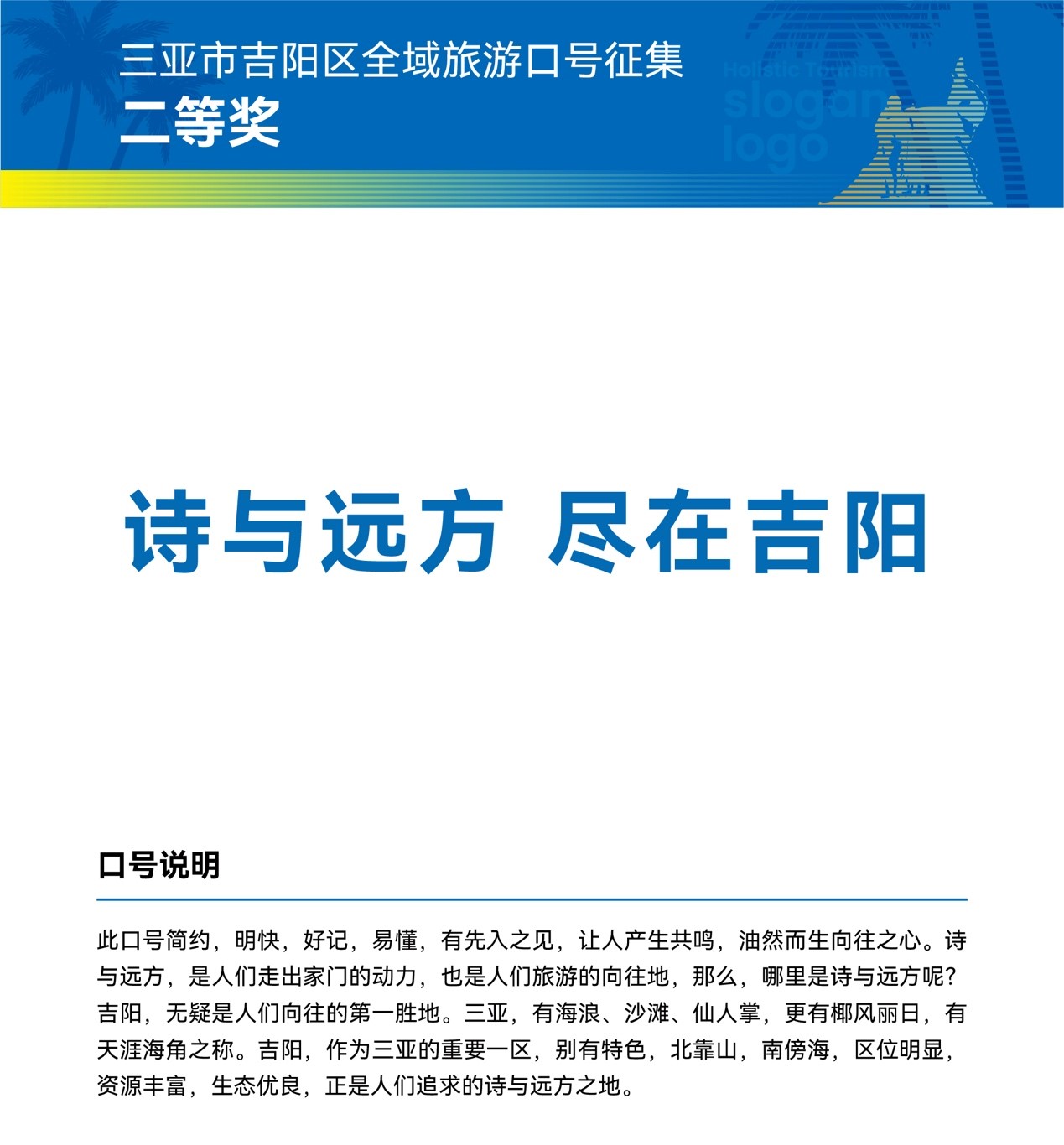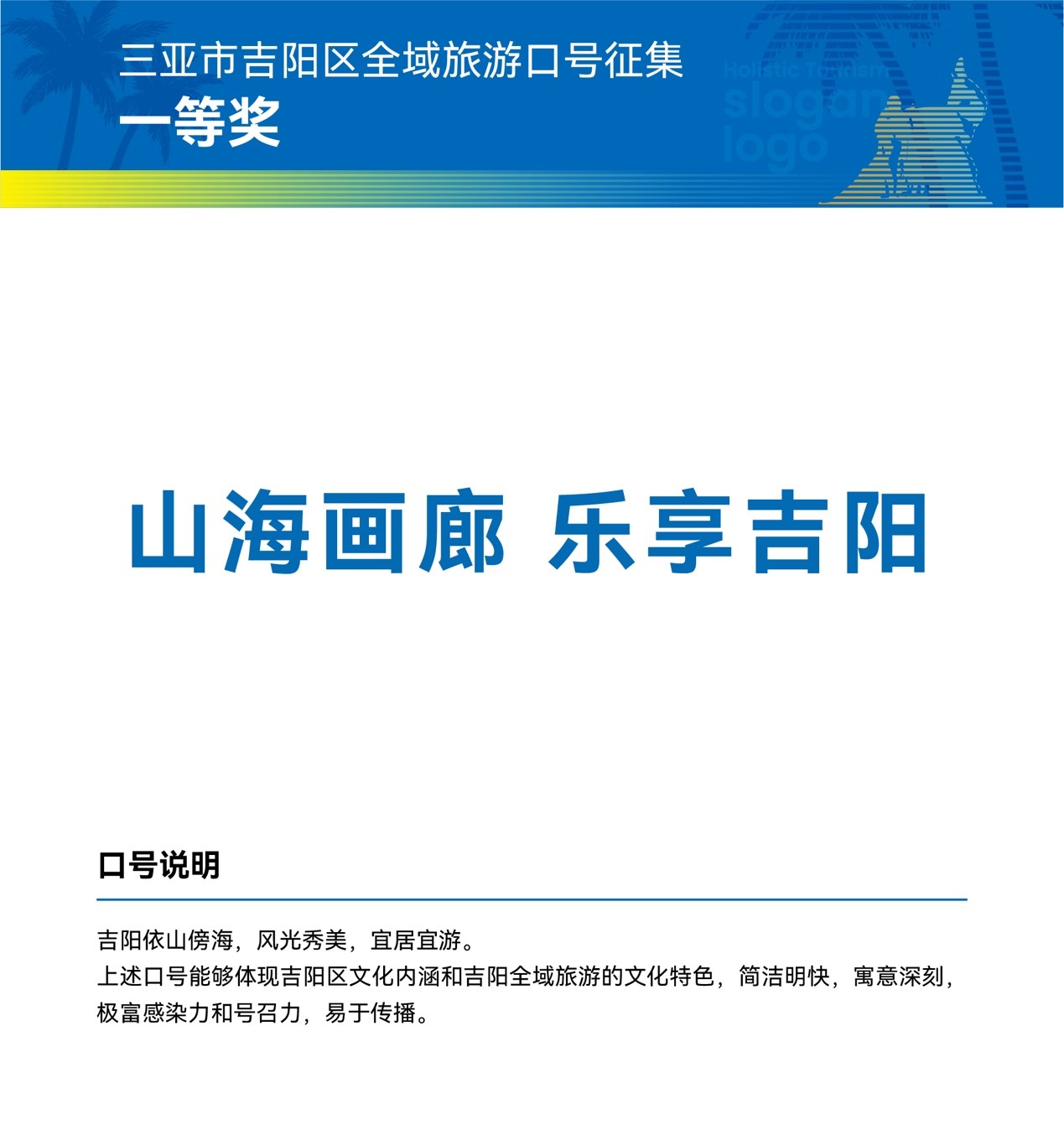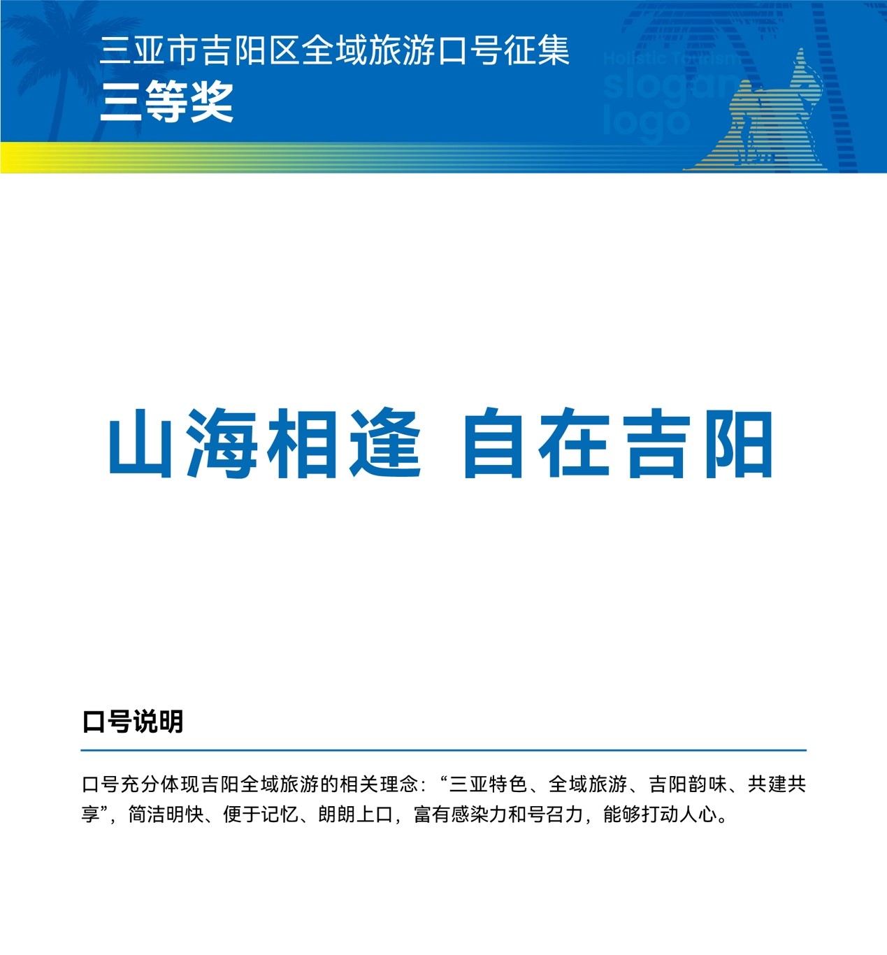 三亞市吉陽區(qū)全域旅游發(fā)展工作領(lǐng)導(dǎo)小組相關(guān)負(fù)責(zé)人表示,獲獎(jiǎng)作品和口號(hào)均以富有吉陽特色和原創(chuàng)的設(shè)計(jì)理念,彰顯了吉陽區(qū)全域旅游的新形象。讓我們攜手共進(jìn),進(jìn)一步宣傳三亞市吉陽區(qū)形象,加速提升三亞市吉陽區(qū)的知名度、美譽(yù)度、傳播力和影響力,推動(dòng)區(qū)域經(jīng)濟(jì)全面發(fā)展。