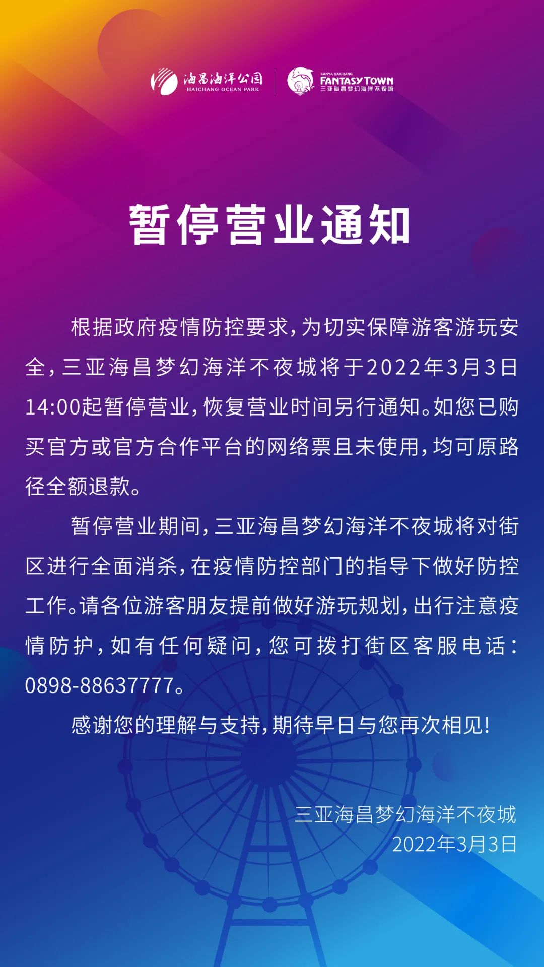 2022年3月3日,三亞海昌夢幻海洋不夜城發布通知稱,根據政府疫情防控要求,為切實保障游客游玩安全,三亞海昌夢幻海洋不夜城于2022年3月3日14:00起暫停營業,恢復營業時間另行通知。