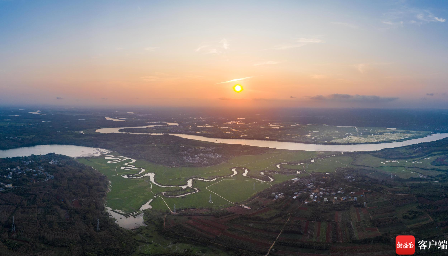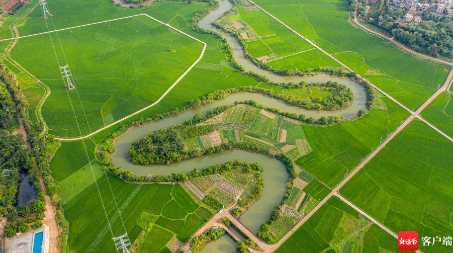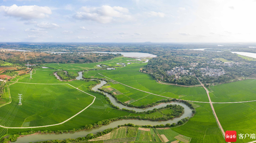 在海口三十六曲溪濕地,水稻與蜿蜒曲折的河道交織成美麗的畫卷,道盡了海南“桃花源”潺潺的流水和綿綿的意境。