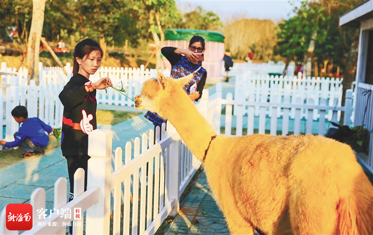 小朋友在定安縣香草田園共享農莊喂羊駝。海南日報記者 張茂 攝