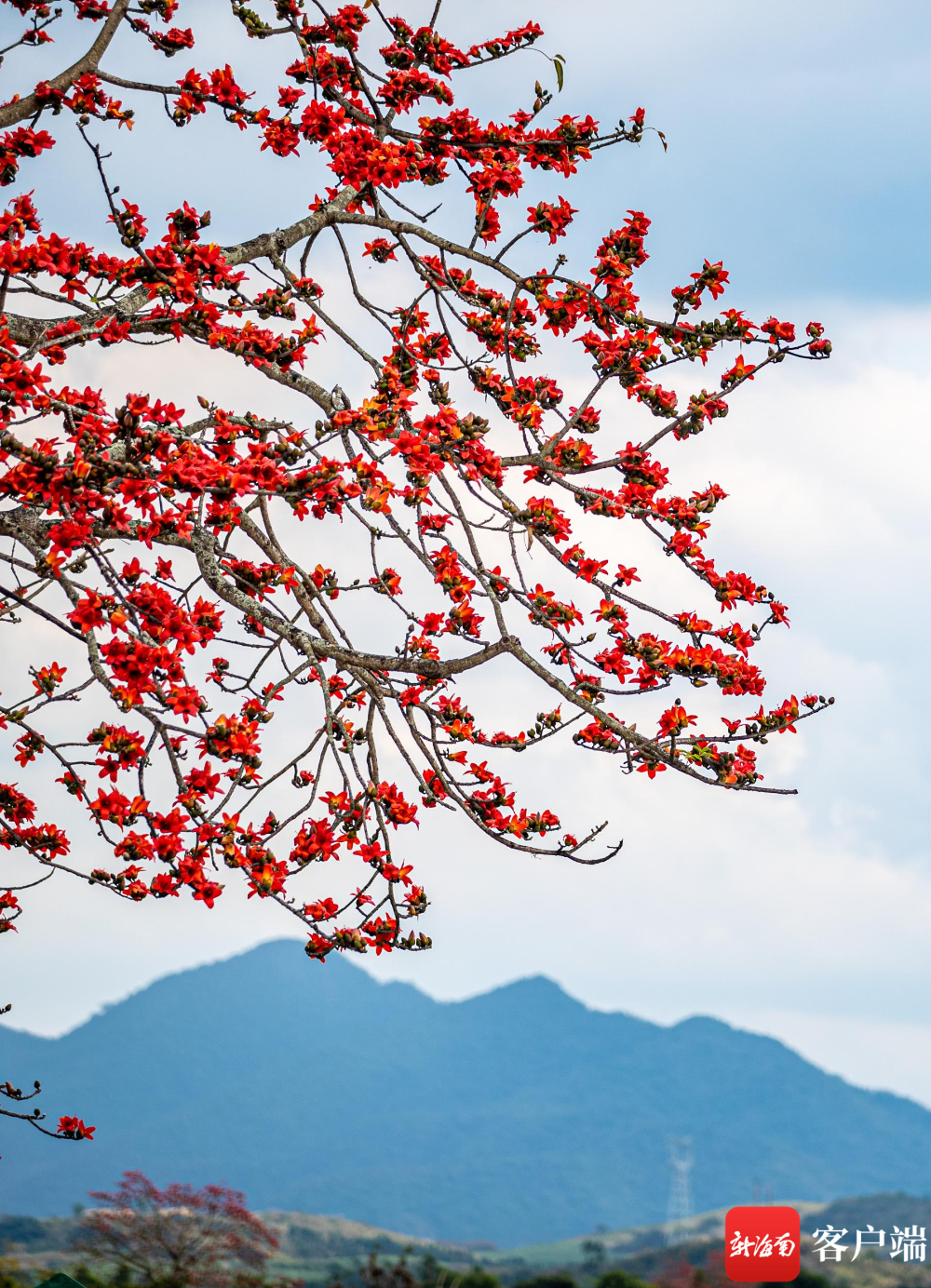 在白沙九架嶺,當朝陽撩開薄紗般的云霧時,在綠水青山間,一株株紅火綻放的木棉花宛如在云霧之中披上嫵媚的紅紗。