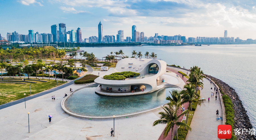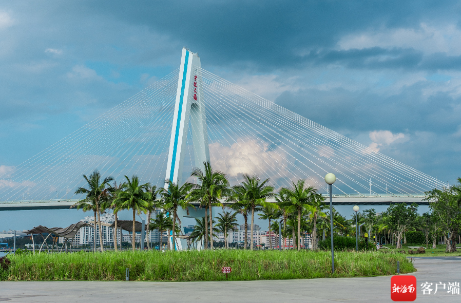 初春的海口灣, 椰樹與世紀大橋相互映襯,別有一番椰城韻味。