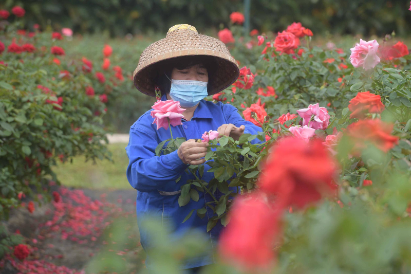4月20日,村民在玫瑰花盛放的田間勞作。記者 沙曉峰 攝