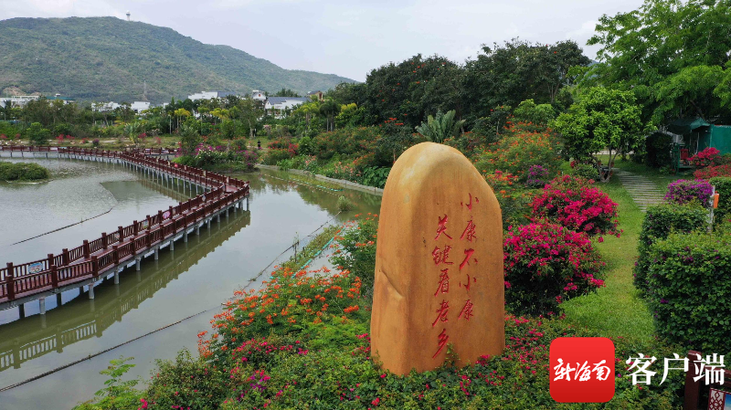 4月20日,三亞市吉陽區博后村,鐫刻著“小康不小康,關鍵看老鄉”的石碑立在棧道環繞的哎岬湖畔。記者 沙曉峰 攝