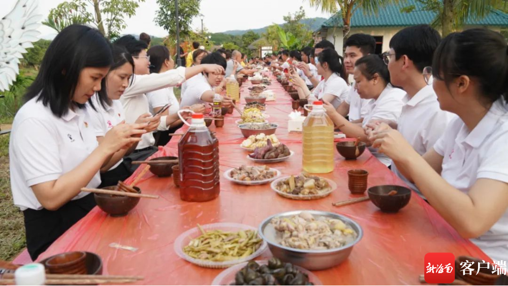當日18時許,長桌宴開席。游客與村民圍坐在一起,黎家兒女拿出三色飯、撈葉炒山螺、芭蕉心燉排骨、山蘭酒等美酒佳肴招待尊貴的客人;現場載歌載舞,一首《歡迎你到白沙來》迎接親愛的朋友,大家牽手歡聚調聲,舉杯祝愿白準村的明天更加美好、走向輝煌。