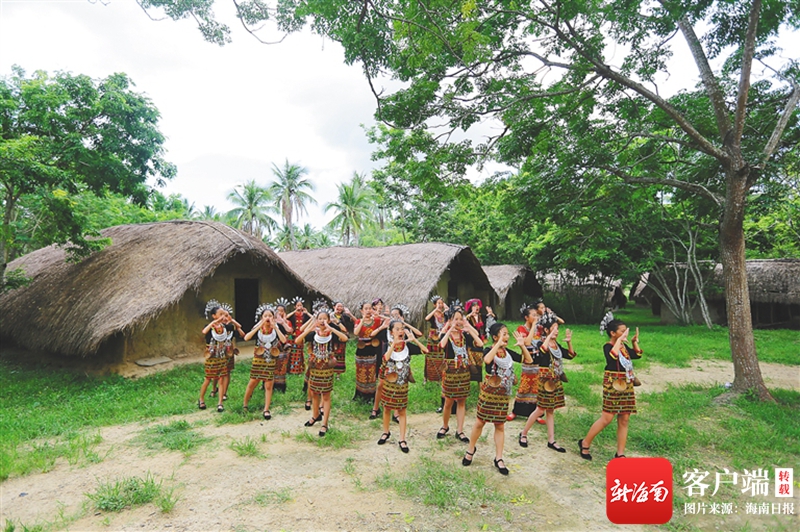 在東方市白查村,小學生在黎族船型屋前唱起黎族歌曲。見習記者 王程龍 攝