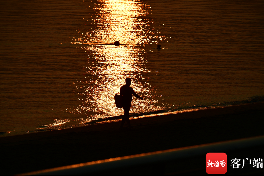 早起游泳的市民,從波光粼粼的海邊走過。記者 陳衛東攝