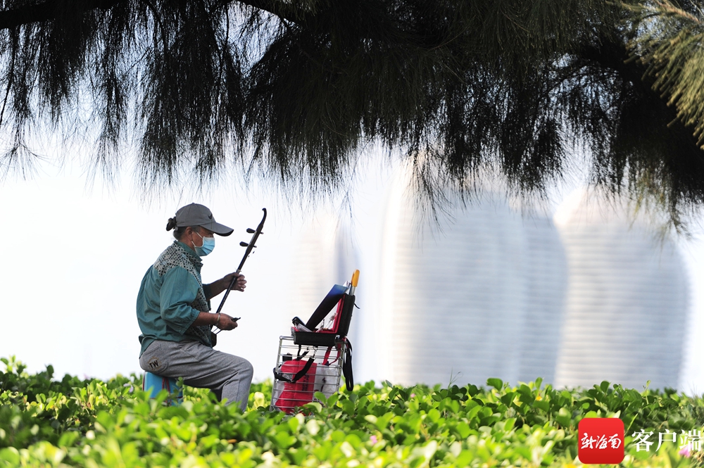 10月25日,海南三亞,“候鳥”老人在三亞灣拉二胡。記者 沙曉峰 攝