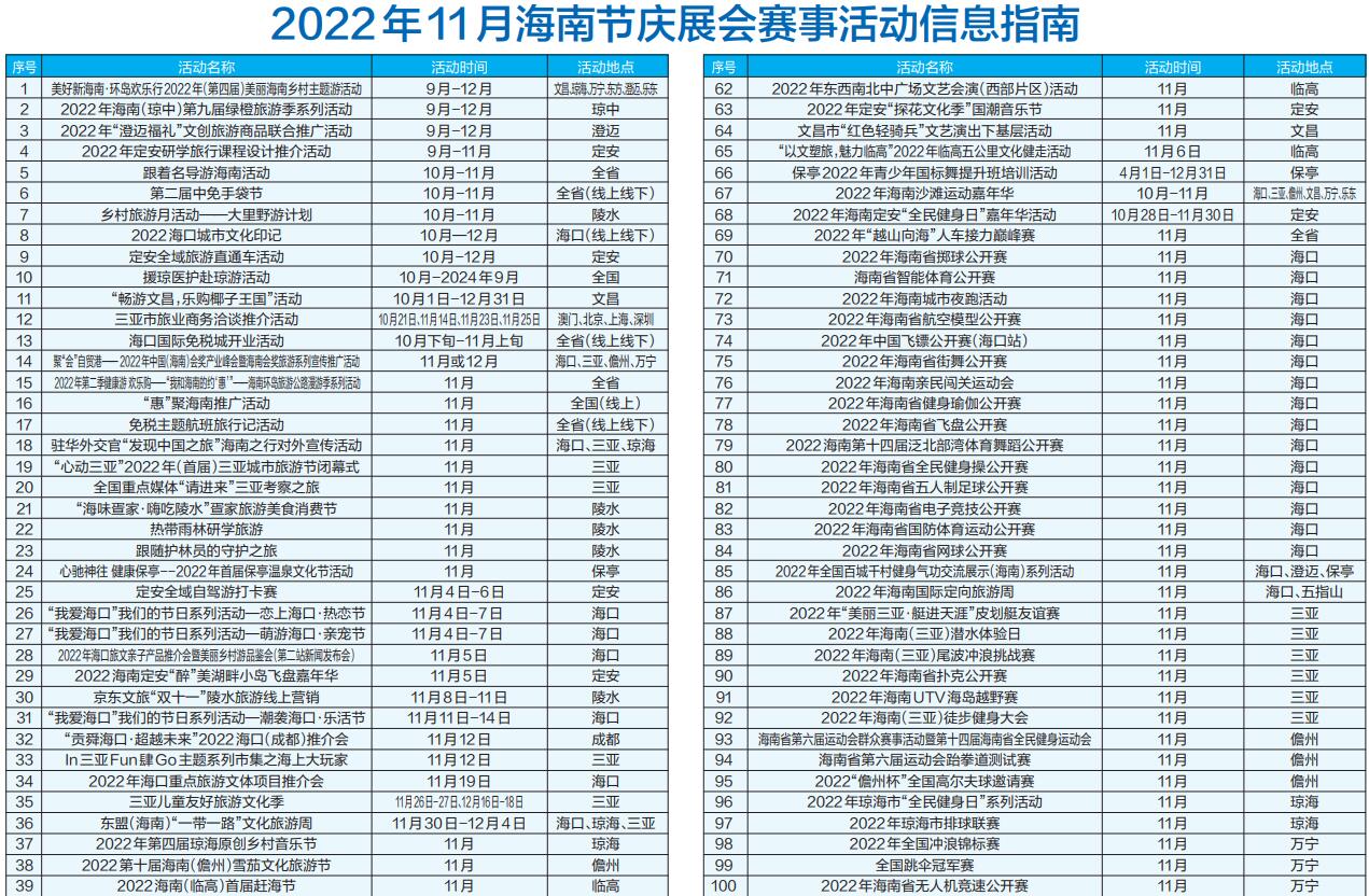 疫散云開,重見海南。為持續(xù)激發(fā)文化、旅游和體育消費活力,海南11月將推出百余場旅文體活動(具體活動詳情可關(guān)注“陽光海南網(wǎng)”公眾號和下載“智游海南”APP)。