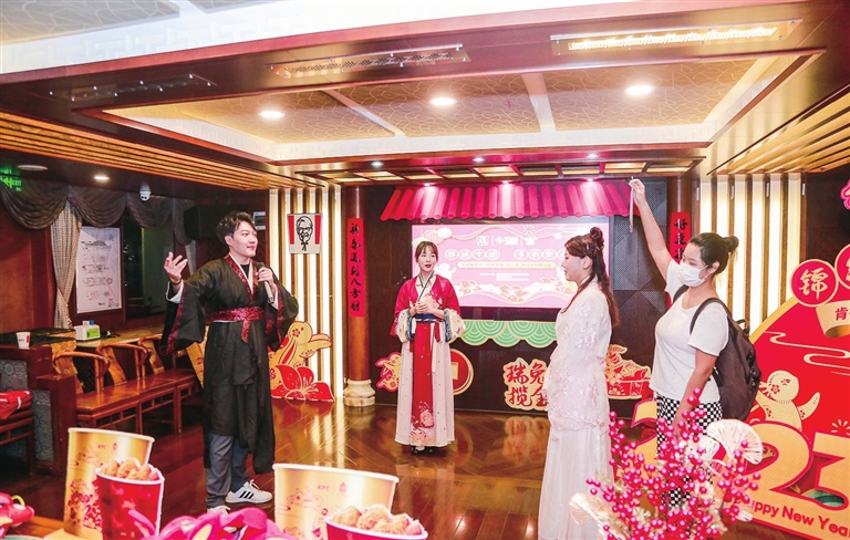“快來看,這里有個年貨鋪子,看起來好可愛好有趣呀!”剛步入一層大廳,游客們就被眼前布置古香古色的“肯德基年貨鋪子”吸引了注意力,紛紛上前詢問拍照打卡。