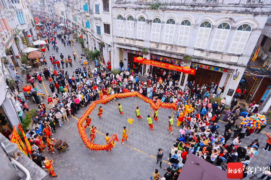 海口騎樓老街龍獅賀春表演。??谑新梦木止﹫D