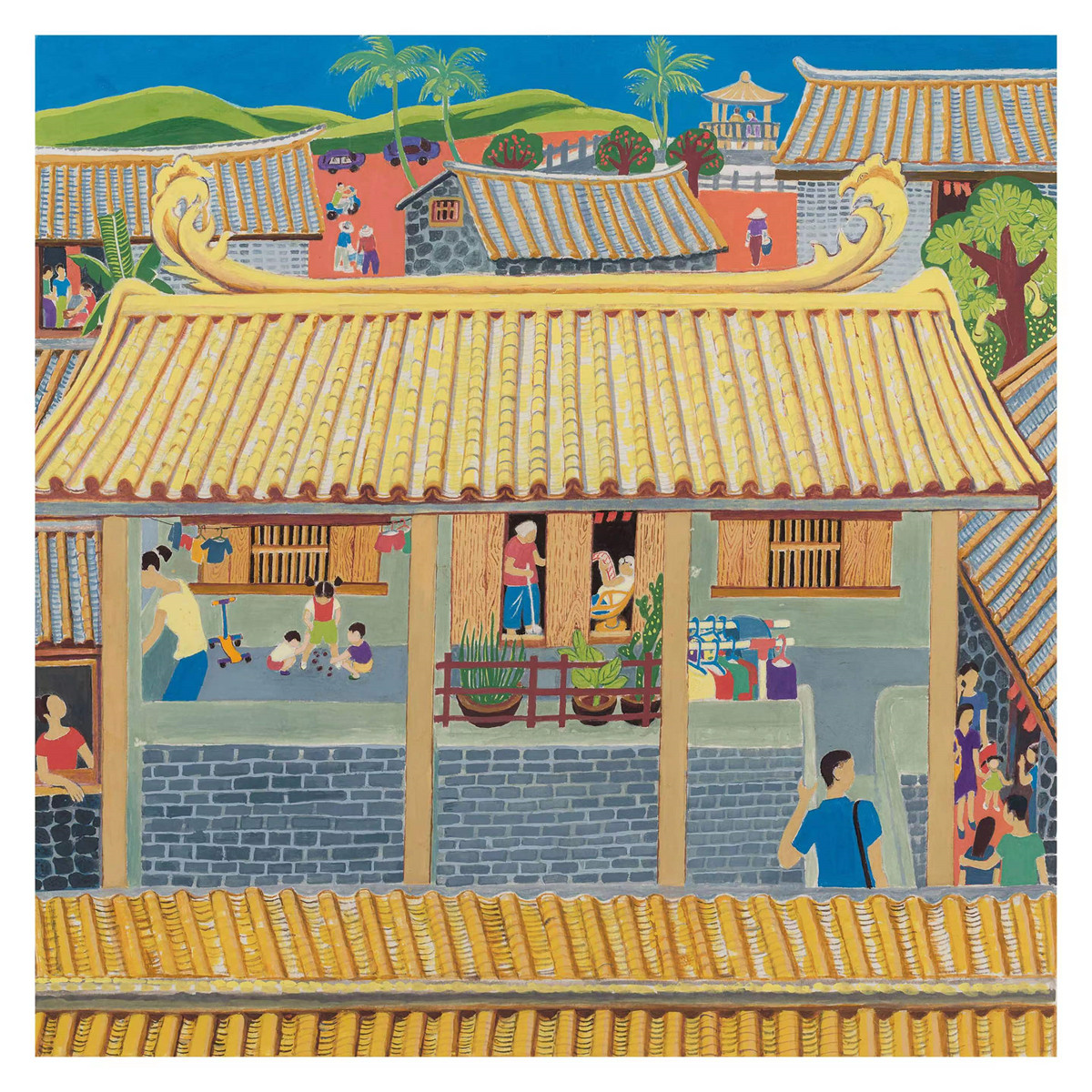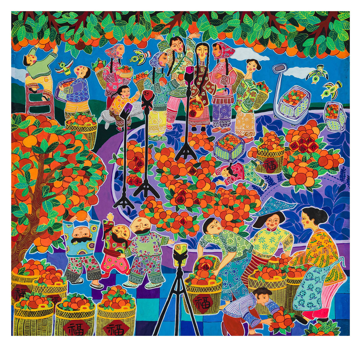 “本次展出中的19件海南農民畫年畫作品題材廣泛,形式多樣,用鮮明熱烈的色彩描繪了海南人民生活的幸福畫卷,抒發了對自貿港建設的美好憧憬。這是本地勞動人民從生活中脫穎而出的民間美術的再創造,作品以海南風土人情為主要題材,以豐富的海南地區民俗情態、外拙內巧的藝術風格為特點。”海南省美術家協會副主席兼秘書長王銳介紹,比如海南作者王娟的《瓊北人家》勾畫出了海南新農村農民住進新屋,其樂融融、安居樂業的幸福情景;吳坤友創作的《福山晨曲》以大圓套小圓的藝術表現形式,生動地表達了農民豐收的喜悅,迎面而來的拖拉機正是海南自貿港努力奮發精神的體現。